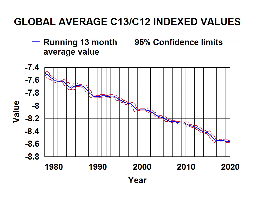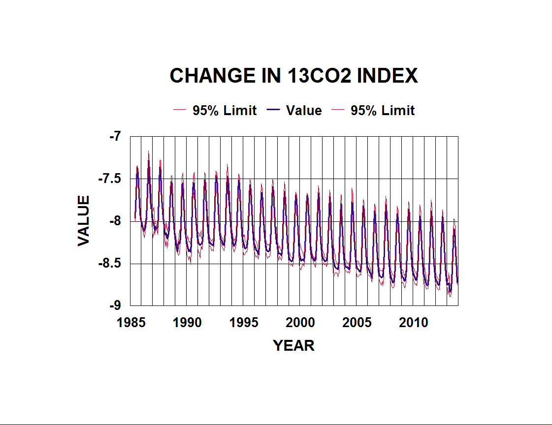 Since around 1977 both Scripps and NOAA have measured the relative concentrations of the stable isotopes of carbon in the flask samples of CO2 using mass spectroscopy. They record their results as an indexed ratio of C13/C12 with the value for C13 assigned as zero. The resulting indexed ratios are negative and get more negative with time. Since these values for fossil fuels range from around -25 for coal to around -40 for natural gas, they assume that anthropogenic emissions have caused the atmospheric values to become more negative with time. Figure 10. show that this is extremely unlikely.
