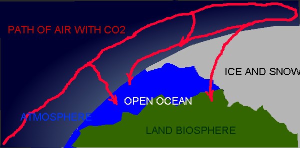 Most of the natural flow of CO2 is from tropical and mid-latitude ocean sources to polar ocean sinks. Thus, material balances on these zones should give us better estimates of natural fluxes of CO2 in the atmosphere. The two main sink zones are 1, north of 45 degrees North and 2, south of 45 degrees South. The source zones are between 45 degrees South and 45 degrees North. The source zones are where the net vertical flux of air, moisture, and CO2 is up primarily as a result of thunderstorms . The sink zones have vertical flows that are down because of a perpetual inversion ( the surface is colder than the air above it).