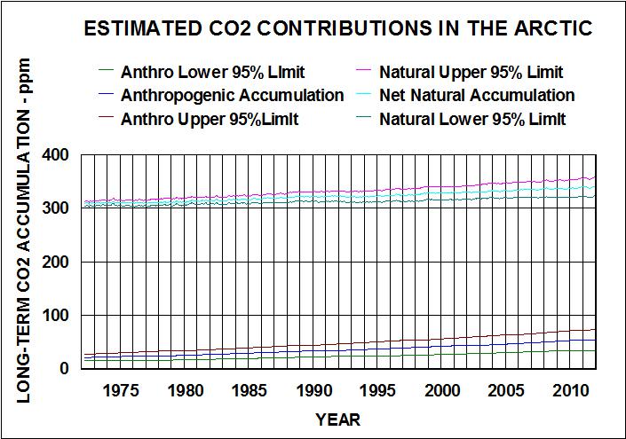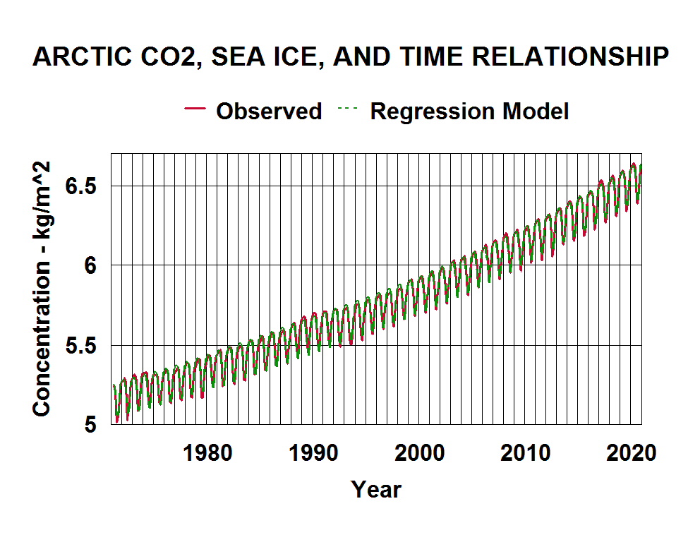 The within year variations in Arctic CO2 concentrations correlate well with the variations in Arctic sea ice concentrations (fraction of surface covered by ice). Table 1. regression results are very strong evidence to this fact. Figure 6. illustrates the degree of fit between the statistical model and observations.
