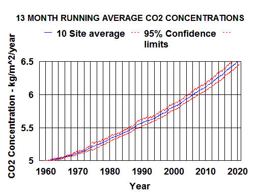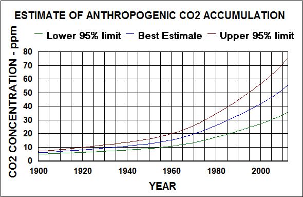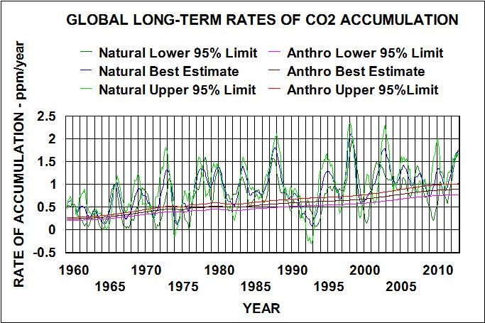 The evidence presented in figures 10 and 12 are based on analysis of average concentrations of ten sites and does not show possible errors. Both NOAA and Scripps have measured CO2 concentrations at the four “baseline” sites (Barrow, Mauna Loa, Samoa, and South Pole). Doing similar analysis on each set of date before averaging allows an estimate of possible errors to be calculated. Two sets of data from NOAA measurements in the US (NWT and KEY) were included with the eight sets of data from baseline sites in calculating the 95% confidence levels. The results are shown in Figure 14. It shows that that it is extremely unlikely for such a small anthropogenic contribution to year-to-year changes in emission rates of CO2 to be measurable. Thus, the blue line in Figure 4. is the best estimate of the natural year-to-year change in global CO2 emission rates.