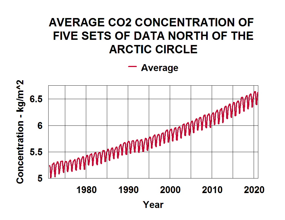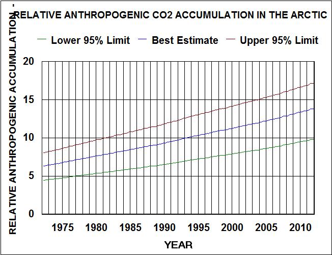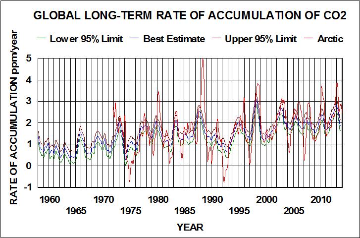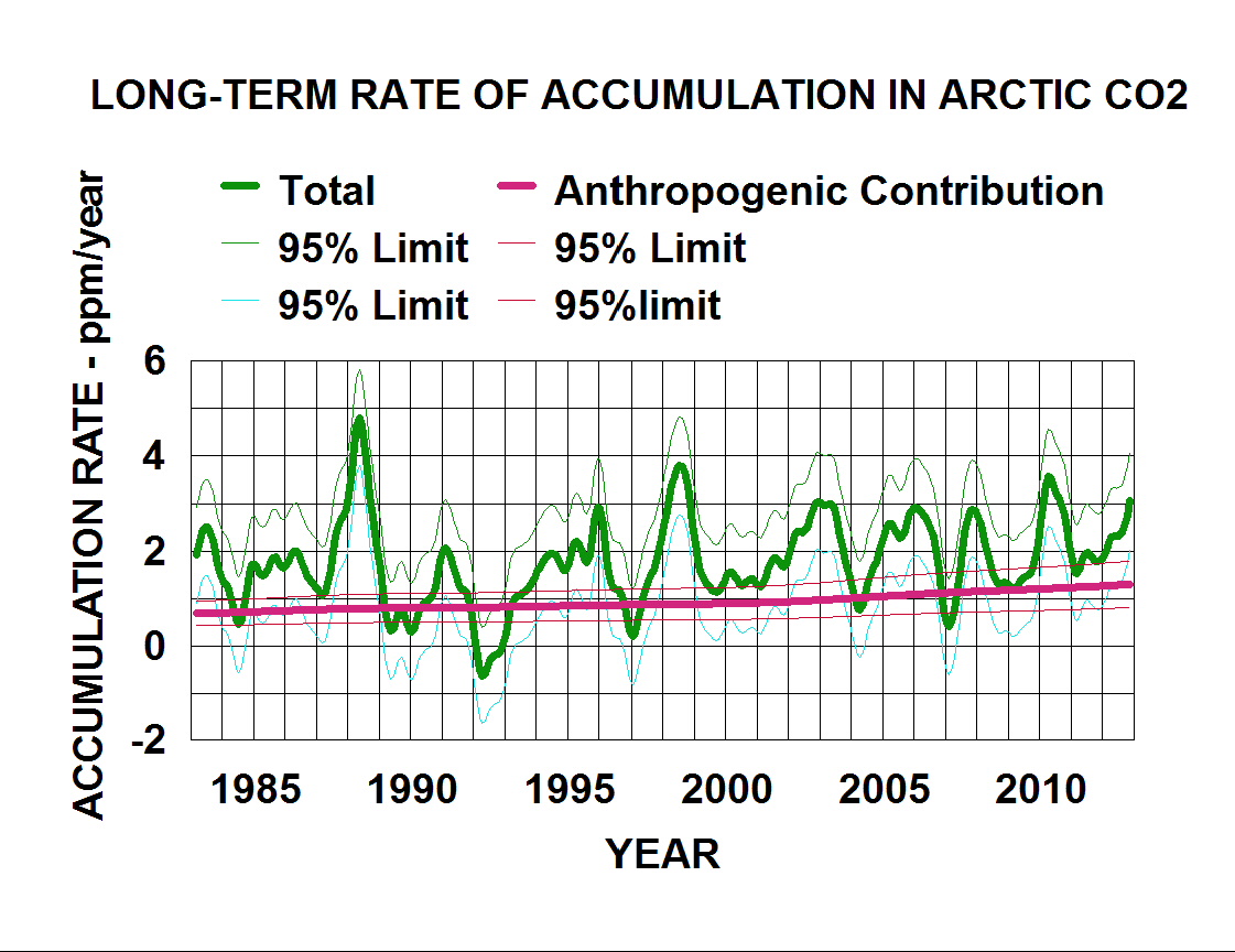 The constantly changing slopes of the curve in Figure 6. reflects both the within year changes related to sea ice freeze and thaw and long-term increases in emission rates from emission zones being delivered to the Arctic. Figure 7. shows the relative contributions of each. At zero on the graph, the sink rates in the Arctic are equaling the emission rates being delivered to the Arctic. Since the green line represents the year-to-year increase in these emission rates, at least two standard deviations of the data indicated by the red line should be added to the values of the green line to get an estimate of the actual emission values. The Arctic ocean is not a source of CO2.