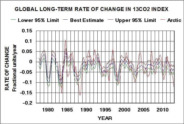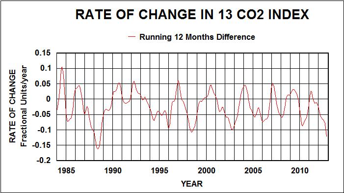 Further evidence that the year-to-year change in emission rates is natural is obtained with estimated indexed values of 13C/12C for DOC. Brittannica reports that 90% of all dissolve carbon is DOC. Seawater – Dissolved organic substances. So dividing the data in Figures 11 by 0.9 gives you estimates of changes in global indexed values of DOC in seawater from year to year. These values are show in Figure 13.