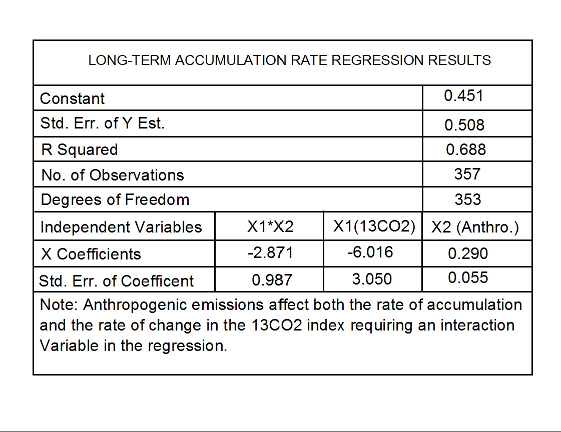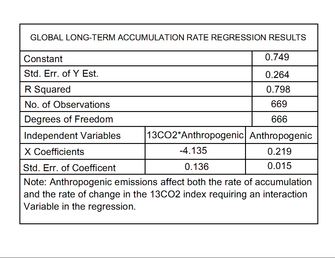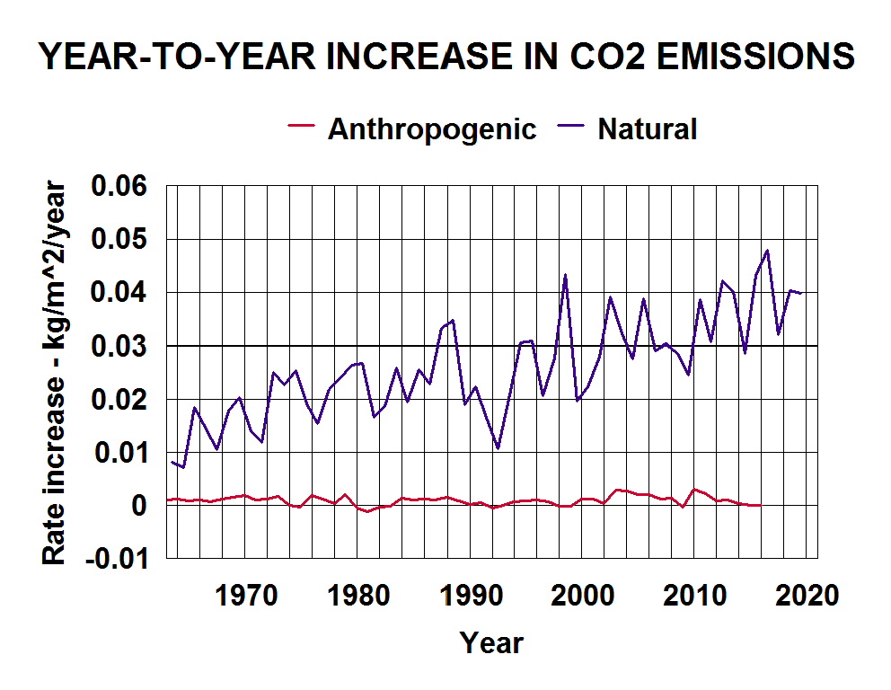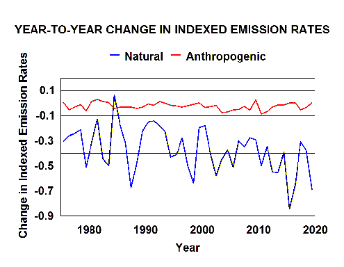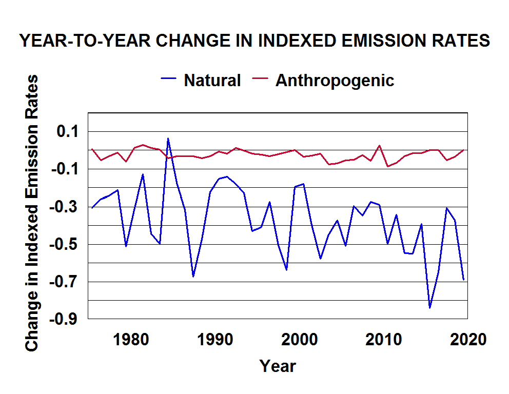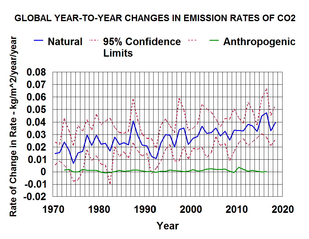 The results shown in Figure 9. is strong evidence that all CO2 emissions (both natural and man-made) are returned to the surface of the earth within a year. The year-to year change in the slope shows the year-to-year change in emission rates. Figure 10. shows these changes as well as year-to-year changes in anthropogenic CO2 emission rates.
