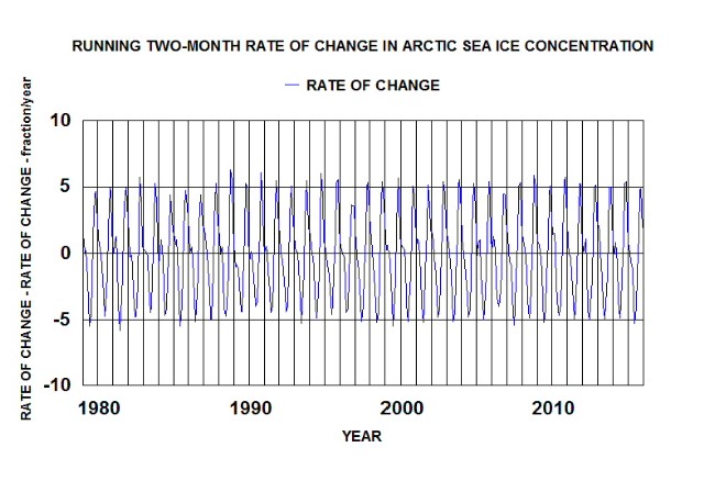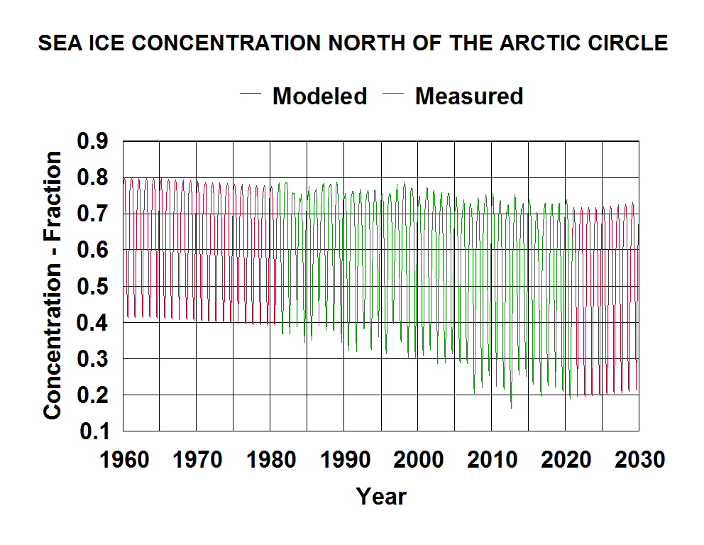Scripps has two CO2 measuring sites in the northern sink zone; Alert, Canada and Barrow Alaska. They measure monthly average CO2 concentrations at five sites, that are in emission zones, that are influenced by northern sink rates. The monthly averages at these sites can be analyzed to calculate the net within year sink and emission rates as well as the year-to-year change in net rates. The month-to-month changes in CO2 concentration is a measure of the sink rates in the sink zones. The big sink is the cold open water of the Arctic Ocean and, thus, sink rates are directly related to sea ice concentration changes with time. Satellite measurements of sea ice concentrations in the Arctic started in 1981 (Climate Explorer: Starting point). I have analyzed the reported data for area north of the Arctic circle (665 degrees north) and used curve fitting to estimate values between 1960 and 2030. The results are shown in Figure 4.