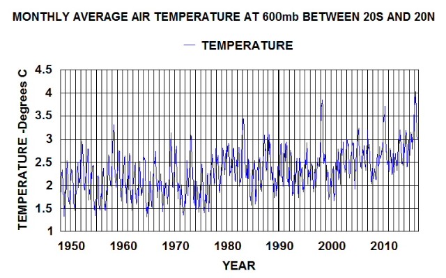 IPPC models assume the amount of CO2 in the atmosphere is the “control nob” for OLR and thus atmospheric temperatures. It is more likely that other factors including OLR are controlling natural emissions of CO2 into the atmosphere from tropical oceans. NOAA’s re-annalysis monthly average met and OLR data combined with CO2 emissions data can be analyzed to determine possible relationships. To relate the Met data to the global year-to-year data for CO2 as expressed by the blue line in Figure 4. the emission area selected for calculating the met data is from 23 degrees south to 23 degrees and 150 degrees east to 270 degrees east. This tropical Pacific area includes el Nino areas that are recognized to have strong effects on global weather. The more accurate UAH sattlelite data is used to calibrate the re-analysis temperature data.