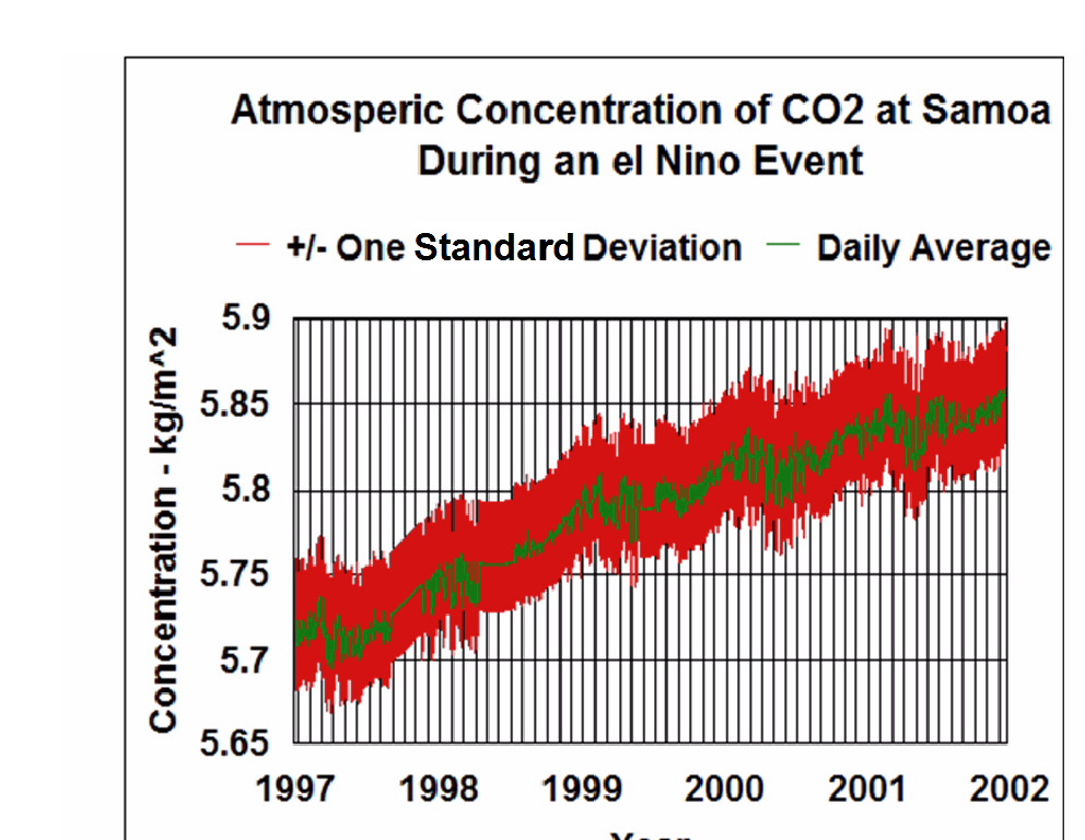 The four base-line sites are Point Barrow (sink zone), Mauna Loa (source zone), Samoa (source zone), and South Pole (sink zone). The sink zones are not significantly affected by daily radiation changes because the light/dark cycle is a year long with a low sun angle during the light phase. Samoa (emission zone), exhibits the least seasonal variation in atmospheric CO2 concentration and the most daily variation among the four sites. Figure 1, of five years (1997 to 2002) of hourly average data illustrates this behavior at Samoa. I chose this period because the spreadsheet I use has a limited data capacity and the dates include a major el Nino event.