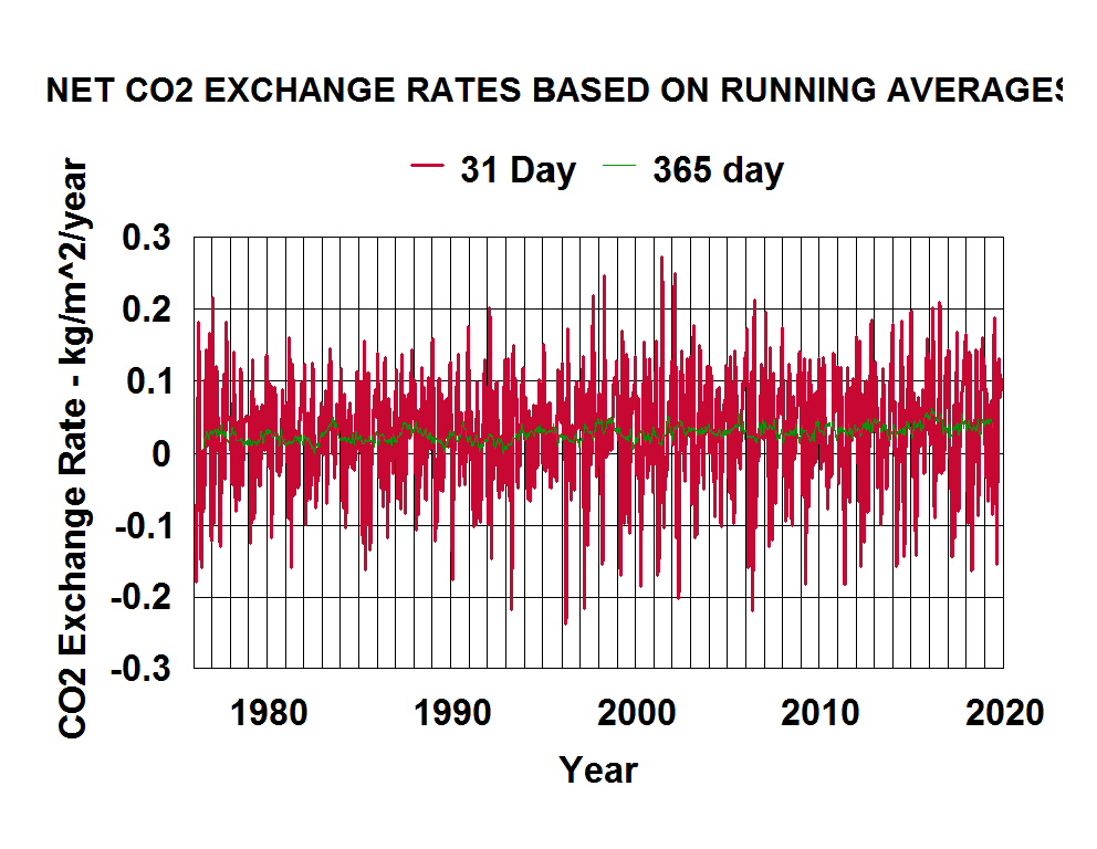 The difference between the hourly and daily graphs indicates that most of the emissions during a day are returned to the surface within a day. Both rain and down-drafts are the downward flux mechanisms. The average daily standard deviation is comparable to an ocean/atmosphere exchange rate (both up and down) of around 50 kg/m^2/year; which is much larger than the net exchange rates indicated by daily averages (green line). The green line represents the emission rates of CO2 out the tops of thunder-clouds; that are being delivered in the upper atmosphere to the sink zones, Thus, the year-to-year differences indicate gradual increases in the net emission rates (not accumulation).