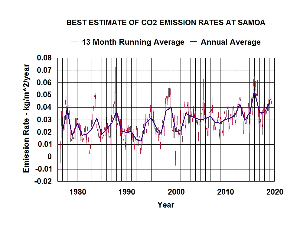 Most atmospheric CO2 concentration data are recorded as monthly averages and annual averages can be calculated from these values. So the green line in Figure 2. can be calculated from the monthly data. It should be noted that these running year-long averages are similar to a second derivative rather than a first derivative (rate of change in emission rates rather than emission rates). Figure 3. shows such calculated estimates for net changes in emission rates at Samoa.