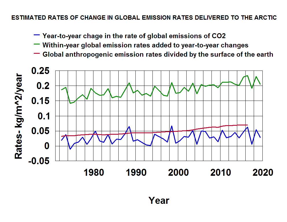 The long-term changes in emission rates of CO2 delivered to the Arctic are illustrated in Figure 8.