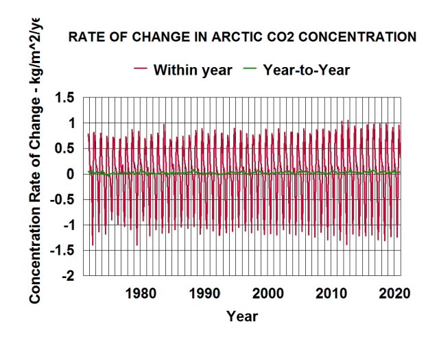 The year-to-year changes (green line) are much smaller than the month-to-month changes (red line). So most of the annual emissions in source zones are being returned to the surface at sink zones. A small fraction (green line) represents a relatively small net increase in year-to-year emission rates. Carbon dioxide does not accumulate in the atmosphere beyond a year. The concentration does build up over freezing sea ice during winter.