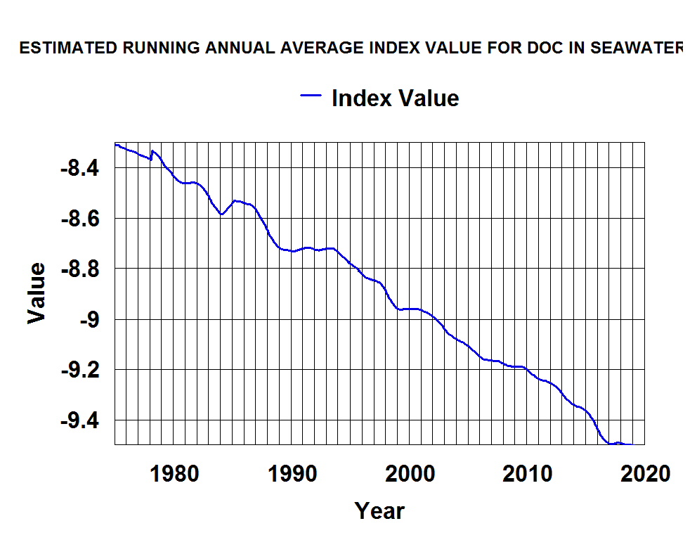 Figure 12. shows the year-to-year change in the product of the concentration data in Figure 10. (C) and the indexed values in Figure 11. (I). This product (C*I) is equal to the organic fraction concentration (DOC=Dissolved Organic Carbon) times the indexed value of that fraction because the inorganic fraction concentration (DIC) is assigned the value of zero.
